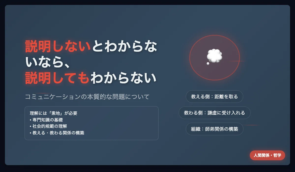 以上が、「説明しないとわからないなら、説明してもわからない」の詳細である。これはとどのつまり、理解をするための基礎的な概念について体得できていないことに尽きる。
