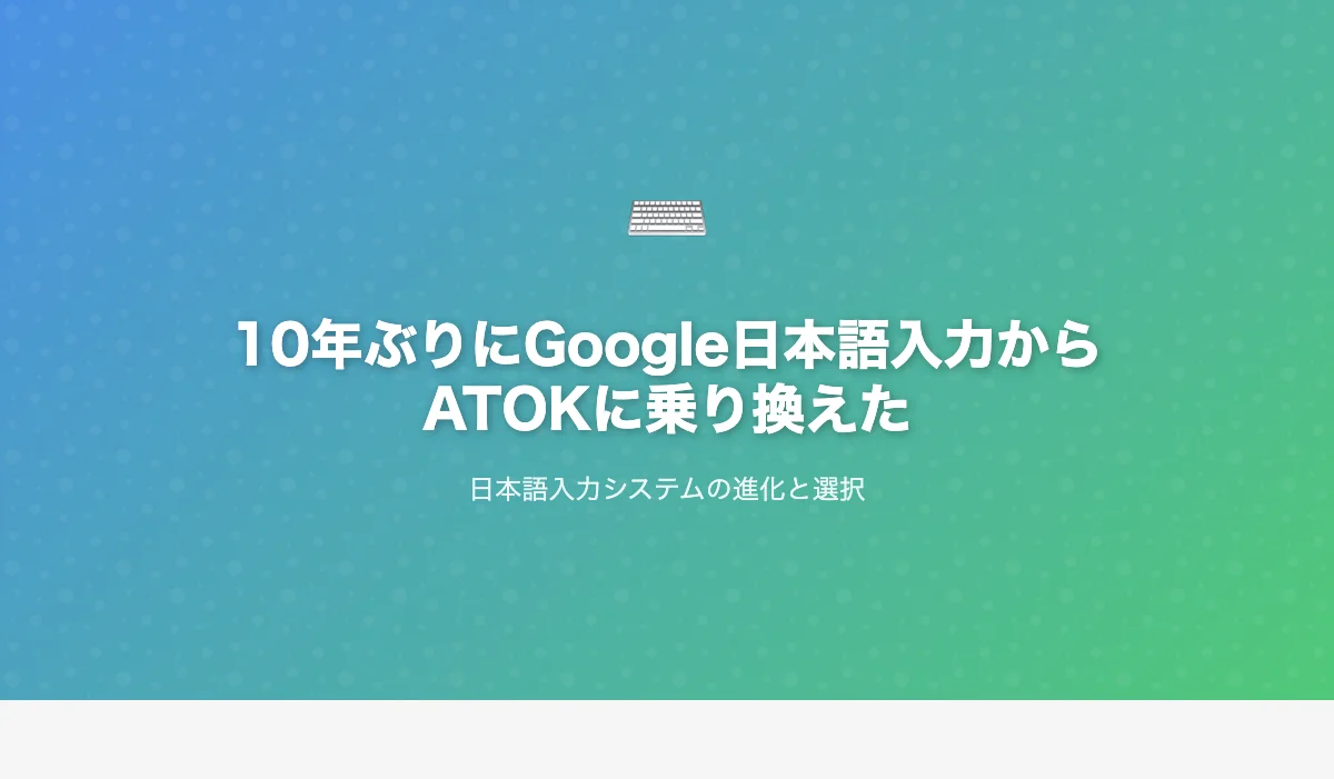 もう10年ばかりGoogle日本語入力を使ってきている。大きな不満があったわけではなかった。多分きっかけは、「久しぶりにATOKを使ったら最高だった!!! - ケータイ Watch」の記事を読んだことだろう。以前だったら「まぁ昔は僕も使っていたな」と思ったくらいで素通りした気がする。ただ、今回はどういうわけかやけに引っかかって、その後いろいろと調べたりした。僕の中でどういう心境の変化があったのだろうか。