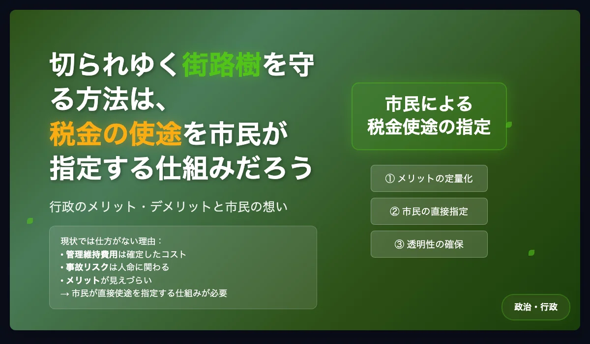なるほど。まぁでも、こうなるのは仕方がないことに思える。というのも、行政側に街路樹を管理するメリットがなく、その癖デメリットばかりがある。管理維持費用は目に見える確定したコストだし、何より事故発生時のリスクは最悪人命にまで至ってしまう。今は反対している住民も、台風などで一度倒木などがあれば、管理の不備を声高にあげるだろう。
