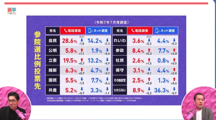 しかし参政党はどうだろうか。参政党は、左寄りはもちろんだが、保守系に至るまで、ほぼ全方位から批判されている、というのが認識だ。実際、選挙ドットコムの調査によると、電話調査とネット調査で支持率に差が無い、むしろ電話調査のほうが支持率高いくらいだ。