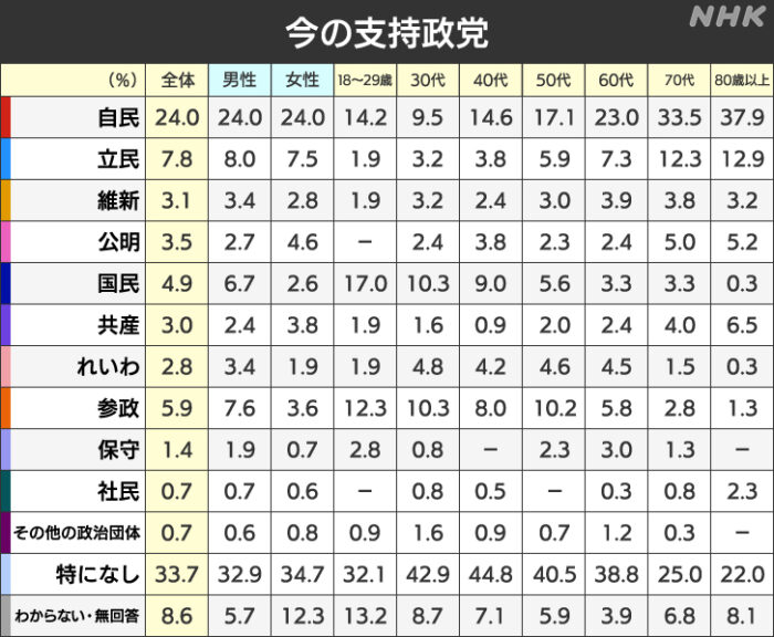 NHKの調査(「政党支持率 自民は政権復帰後最低24.0% 立民7.8% 参政5.9% 参議院選挙前NHK世論調査 | NHK | 参議院選挙」)によれば60代まで1-3位だ。まぁ年令層別はサンプル数が少ないので瞬時値を見ても仕方ない。たとえば30代ではック民と並んで1位だが、しかしハッキリ言ってどちらが上かは誤差の範囲だろう。しかしこれは、偶然だけで出てくる数値でもないだろう。