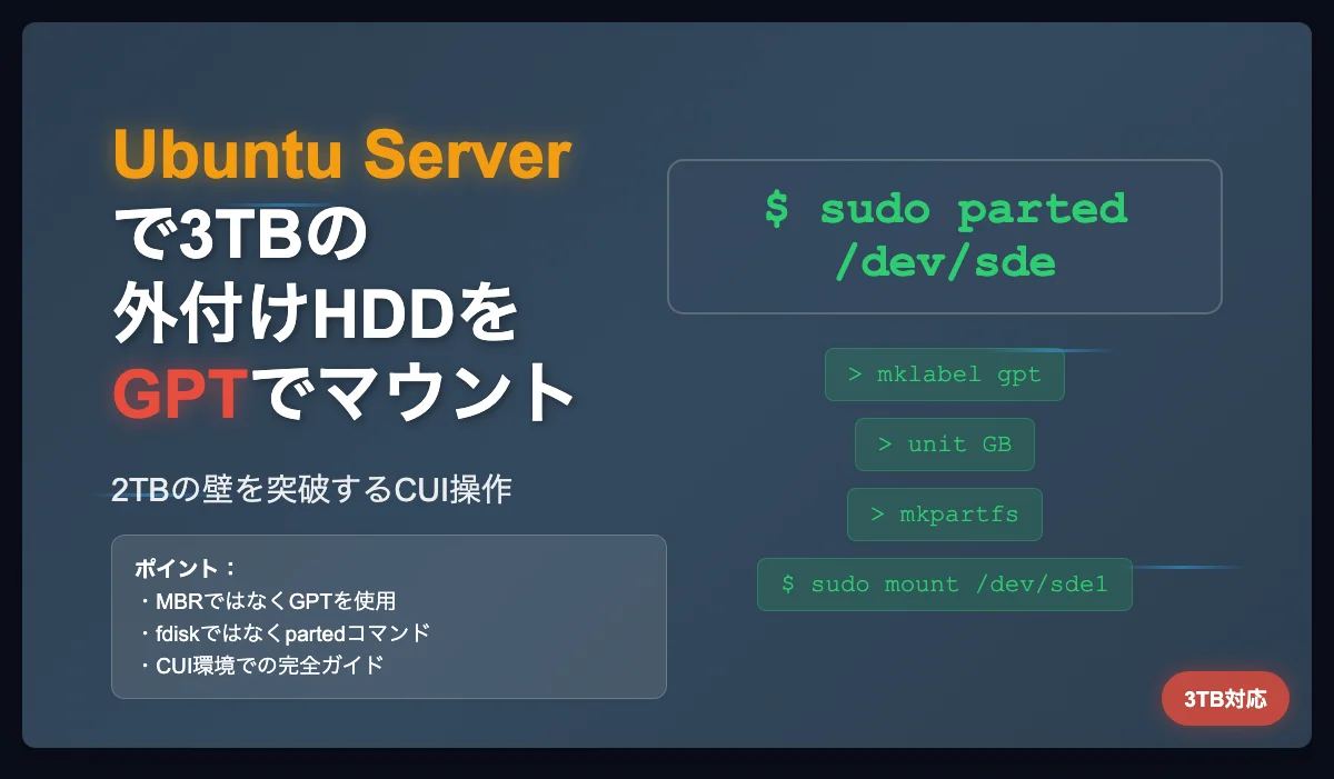 今回の記事は、3TBの外付けハードディスクをUbuntu Server 12.04で使う、というものです。ポイントは以下。