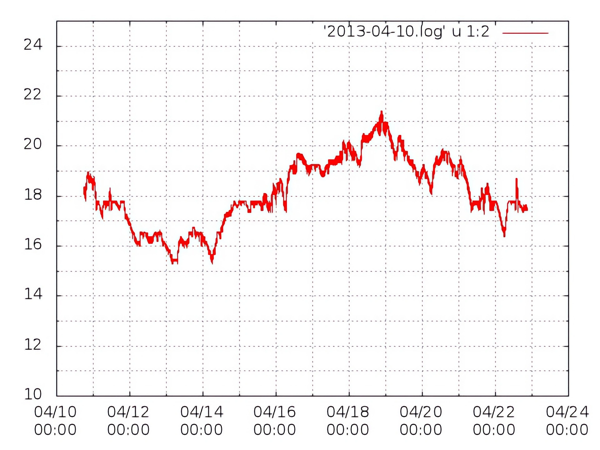 これで、グラフ化させることができます。出力ファイルは上記の例だとnow.pngです。常にグラフ化させたいなら、一番簡単なのは $ watch -n 10 "ruby plot.rb 20130410.log" とかですかね。あるいはシェルスクリプトのlog.shにruby plot.rb 〜の一文を忍ばせてもよさげです。結果は↓みたいな画像になります。