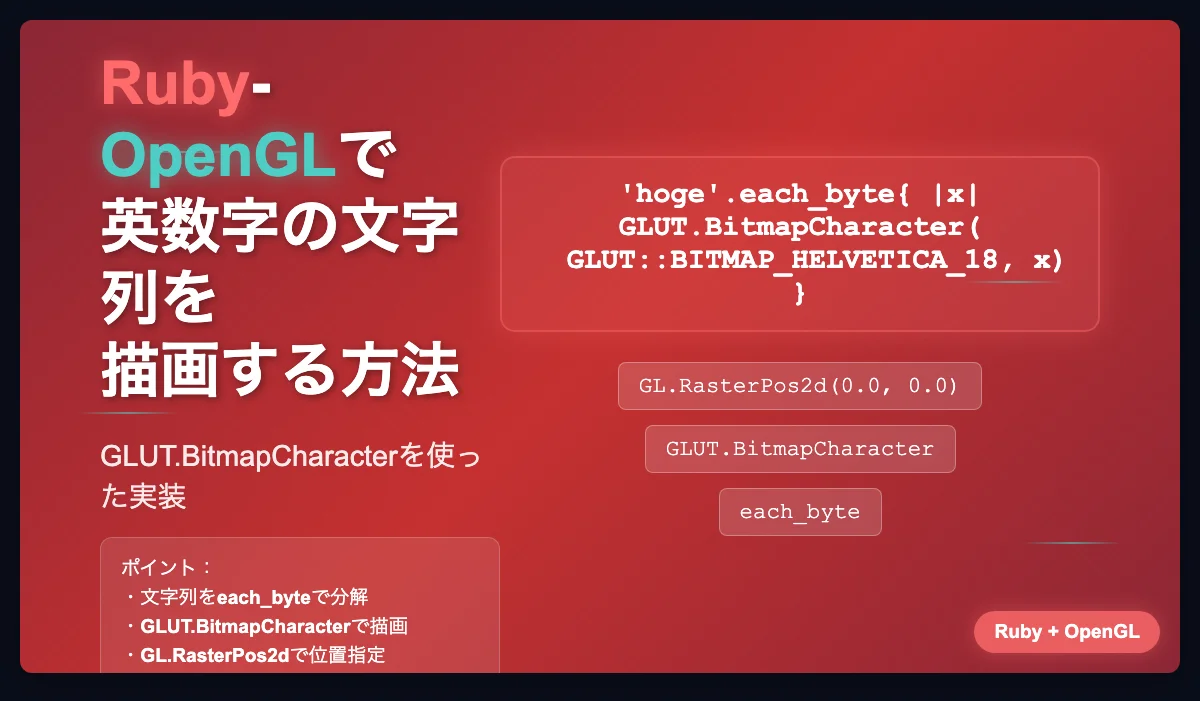 ちょっとハマったのでメモ。結論から言うと、文字列オブジェクトをeach_byteで分解して、GLUT.BitmapCharacterを用いる。hogeと描画したかったら、