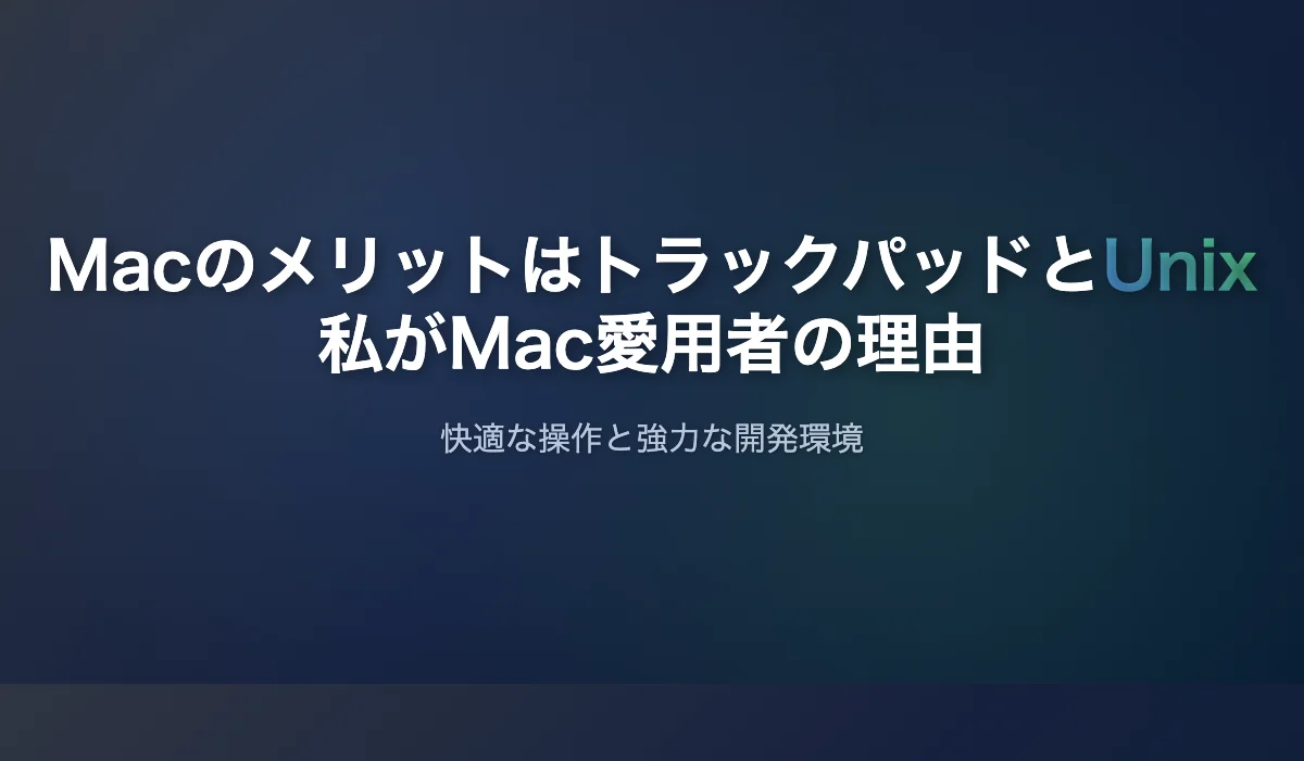 何故、私はMacから離れられなくなってしまったのか。Macの良い所とはなんなのか。それを私なりに記述するのが本記事の目的です。最初に結論を書くと、私が思うMacの素晴らしいところは二点、トラックパッドとUnixです。他にも魅力的な点は勿論多くあるのですが、突き詰めるとこの二点です。