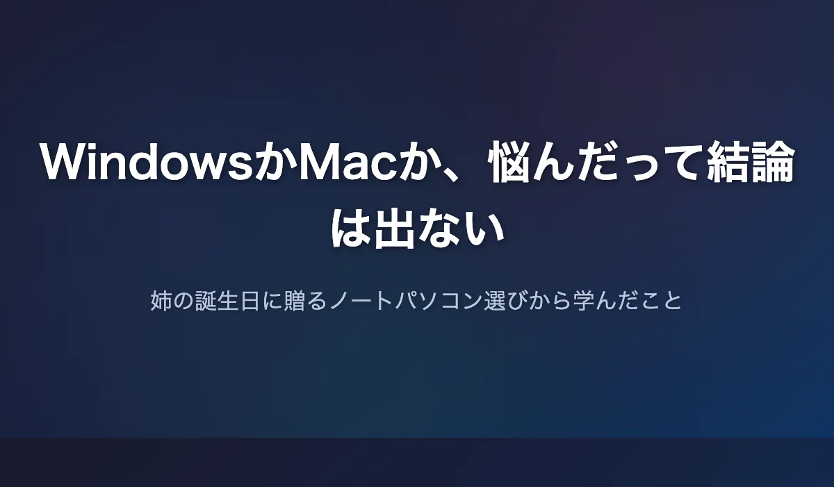 姉の誕生日にノートパソコンを贈ることにしたのですが、その時姉に「Macは難しいんやろ?」と言われました。元よりMacになるとどうしても値段がそれなりにしてしまうので、姉の用途に必要十分な安めのWindows PCを贈るつもりでいましたが、しかしやはり一般的にMacは難しい印象があるのだなと思いました。