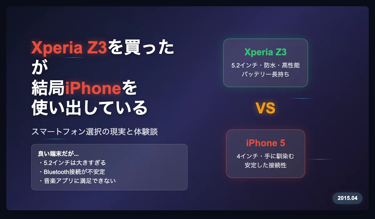 逆に言うと、それくらいでしょうか。また、Bluetooth機器との接続が悪いことが多いです。iPhoneならすんなり接続されるのに、Xperia Z3はどうも毎回手動でペアリング手順をしなくては接続されなかったりと、不安定なことが多い。この点については、やはり数が多く確実にテストされているであろうiPhoneの強みといったところでしょうか。