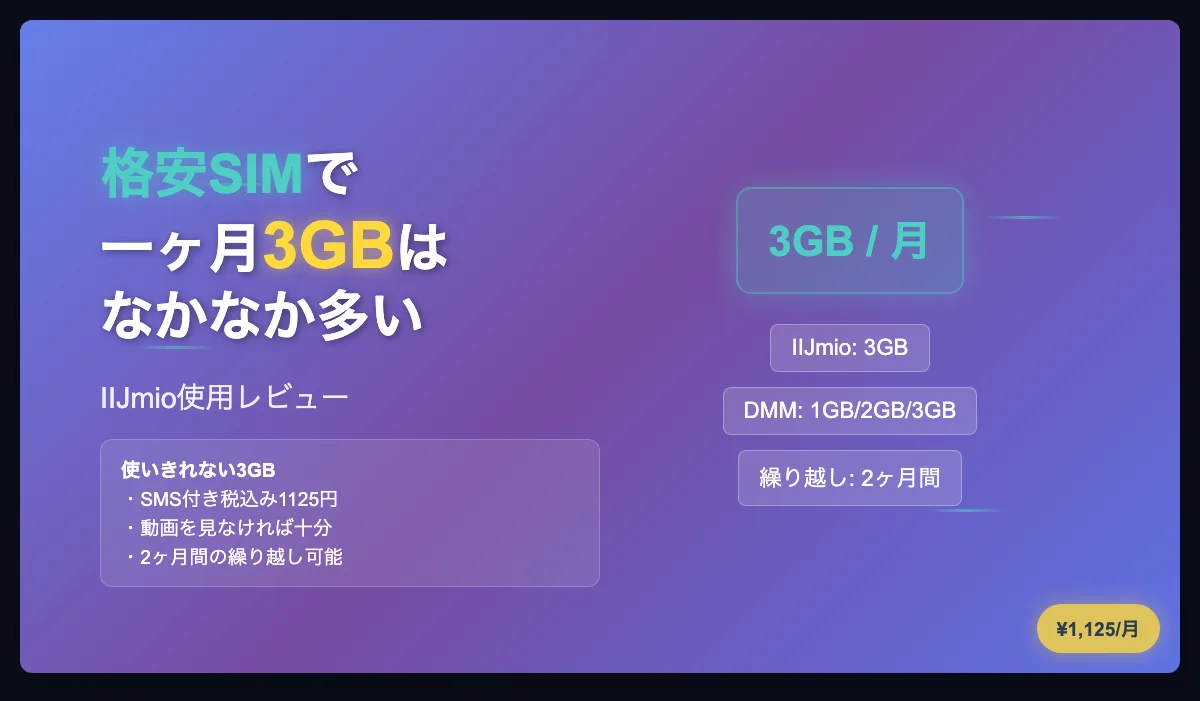 IIJmioと契約しています。最低の料金プランでSMS付き、税込み1125円かな。これで使える容量が一ヶ月3GB。有り難いことに、使いきれていません。