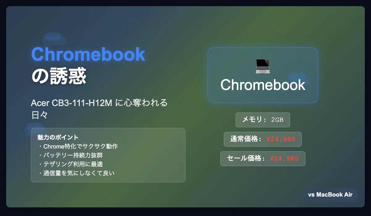 AcerのChromebookが気になっています。CB3-111-H12M、メモリは2GBですが、普段はAmazonで26,980円で、時々タイムセールで24,980円にまでなります。とてもとても気になります。