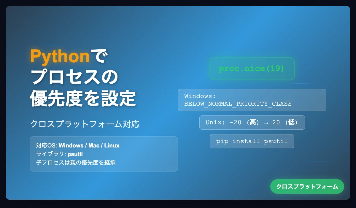 WindowsとUnix環境の両方で、プロセスの優先度を下げるPythonのスクリプトです。つまりWindows、Mac、Linuxのいずれでも動くように。psutilを使うので、pipでインストールしておきます。