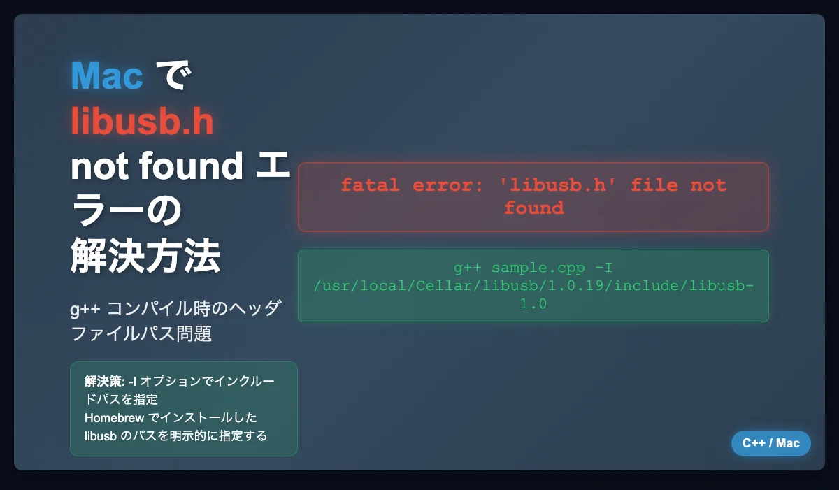 環境はMacで、OSX 10.10 です。libusb をインストールしているにも関わらず、g++ でコンパイルするとlibusb.hが見つからず fatal error: 'libusb.h' file not found とエラーになりました。libusb はHomebrew でインストールしています。