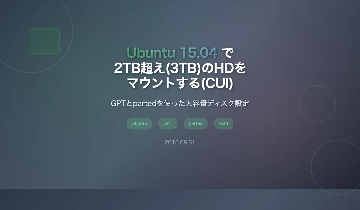 久しぶりにUbuntuを使うと、設定ファイルの書き方など変わっているところもあり、多少戸惑いました。本記事では、Ubuntu 15.04上で、CUI、すなわちコマンドラインにおいて、従来のMBRでは扱えない2TB以上のハードディスクをマウントする手順を書きます。他のディストリビューションでも同様ですが。