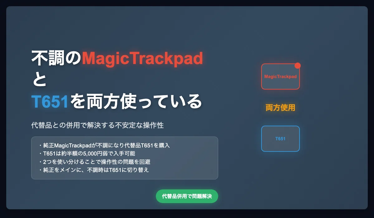 わけのわからないことになってきました。乱暴な使い方が祟って、MagicTrackpadが不調になったのは何度か記事にしています。その後、1万円という値段を見て買い換える気が起きず、Logicoolから販売されている、T651という代替品を購入しました。こちらは約半額の5,000円弱で新品を手に入れることができます。