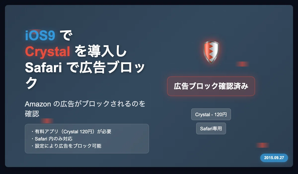 ようやく、というべきかもしれません。iOS 9で、限定的にではありますが、広告ブロックが実装されました。といっても、今のところ新たに有料アプリ(Crystalは120円)を購入する必要があります。また、Safari内だけです。が、利用する人にとっては大きなメリットがあるでしょう。