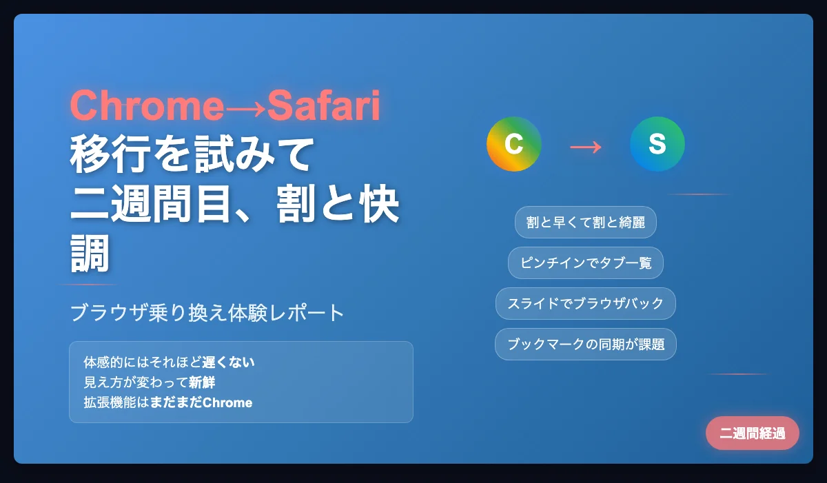 ChromeからSafariに乗り換えを試みて、二週間ほど経過しました(「何度目かのChrome→Safari計画 : 或る阿呆の記」)。どうしてSafariにしようと思ったのか、もはやあまり覚えていないのですが(前記事を見ても「飽きた」としか書いていない…そうだっけか)、Safariの使い心地は昔試した時よりもだいぶ快適で、今のところメインで使えています。