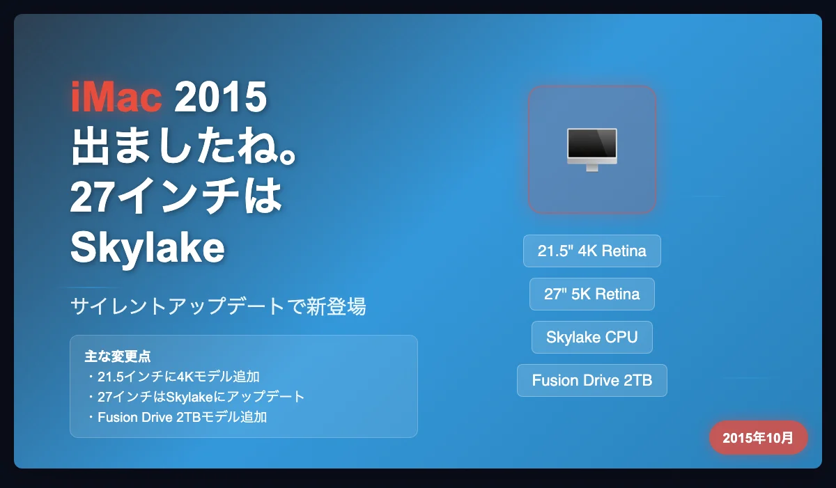 10月中に新作が発表されるのではと噂されていたiMacですが、何の前触れもなくサイレントにアップグレードされました。21.5インチに4Kモデルが出たのと、27インチモデルがまぁ順当にアップデートされた、くらいのものです。CPUがBroadwellなのは残念な気もします。27インチのほうはちゃんとSkylakeのようですけれど。