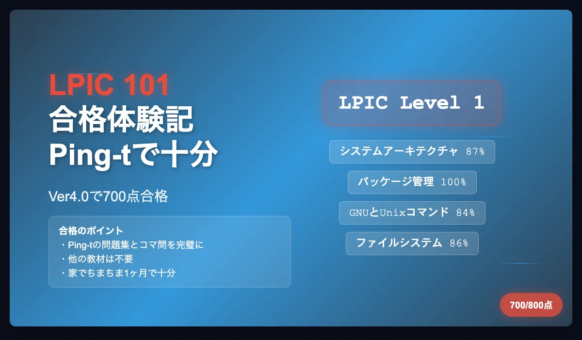 さっき調べてみると、LPICレベル1は初級シスアドと同じくらいだと評されているのですね。となると、世間一般的にはかなり簡単な試験ということになるのでしょうか。個人的には、問題はけっこう際どいところを聞いてくるし、オプションをひたすら覚える苦行もあるのでしんどい試験だと思ったのですが…。まぁ、LPI曰く、ジュニアレベルですからねぇ…。
