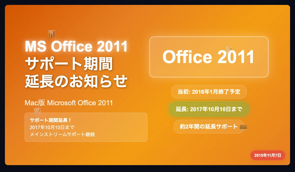 すべてのお客様に標準ライフサイクル移行タイムラインを提供するために、Microsoft Office for Mac 2011 のメインストリーム サポートは表示のとおり延長されました。