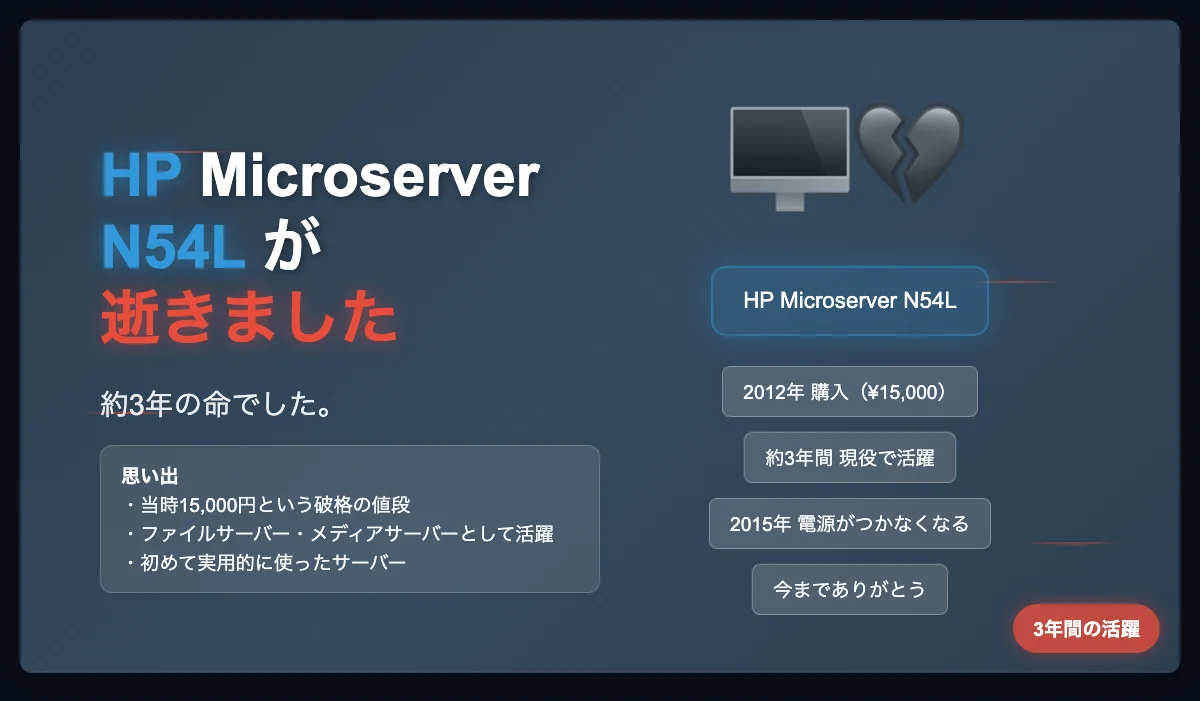 3年というのはちょっと短いような気もしますが、動かないものは仕方ありません。思えば、このマシンは初めて私がサーバーを実用的に使ったものです。たくさんのことを学ばせてもらいました。今までありがとう、お疲れ様。