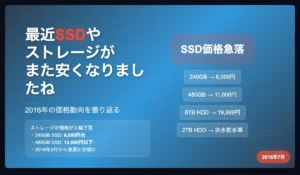 思われていたよりも緩やかではありますが、SSDも少しずつ安くなってきました。500GBクラスのSSDを、18000円弱で手に入れました。二年半ほど前に、同じくらいの値段で256GBのSSDを購入したので、やはり随分安くなったといえます。