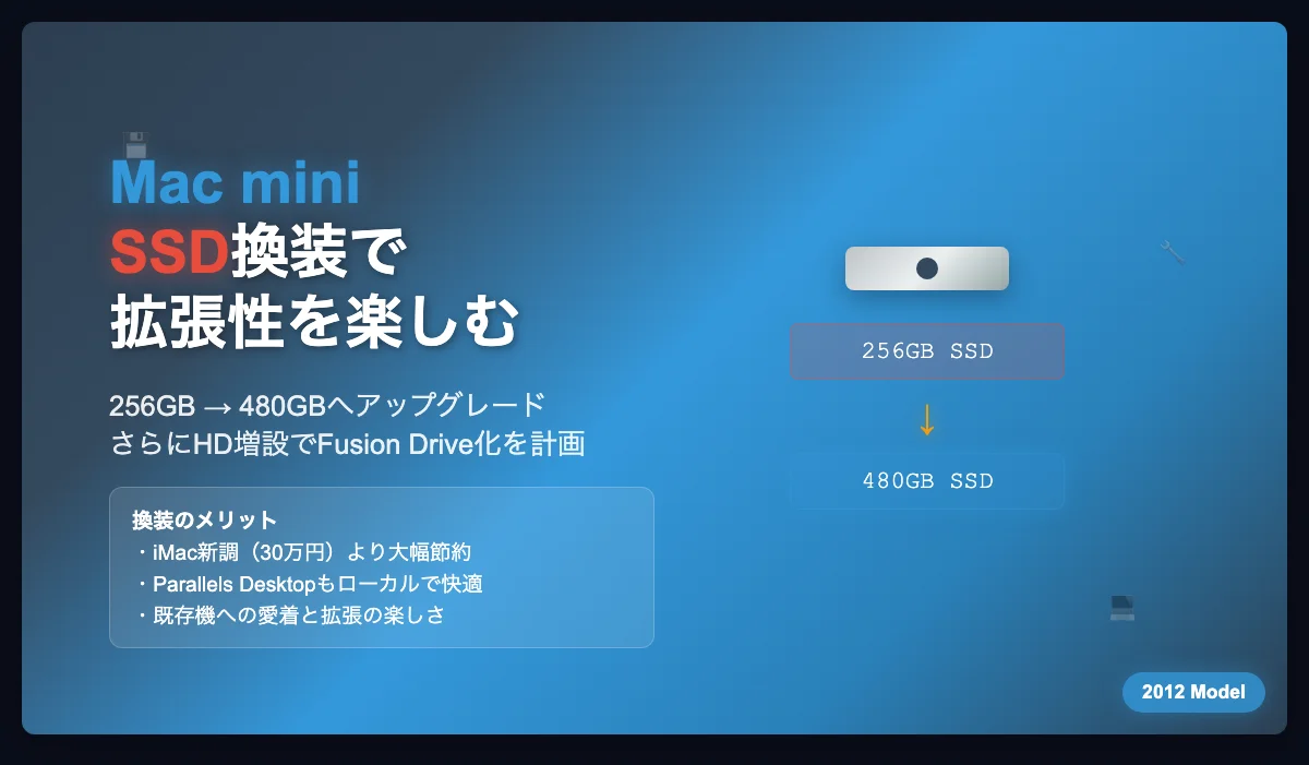 Mac mini 2012のSSDを、256GBのものから480GBのものに換装しました。さらにHDの増設も見据えています。確かに一般的とは言い難いかもしれませんが、PCの拡張性は有難いものです。実際に増設した後の記事は→「Fusion Driveの感触…オススメできる人、できない人」