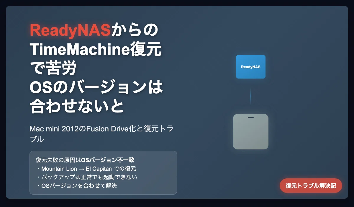 まぁ結論から言うと、恐らくは復元前と復元先のOSのバージョンが合っていなかったことが原因です。とはいえ、今までもそれで復元を実行して、特に問題が起きたことはなかったのですが…まぁ、今までは外付けハードディスクから直接だったのが、今回はReadyNASを使っていたり、ストレージの状態が違ったりと、色々いじっていたので、そういうこともあるのかな、と思いました。