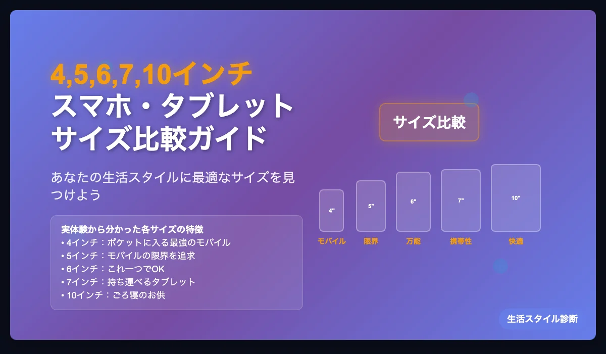 本記事は、私が実際に使った経験から、4,5,6,7,10インチのスマホ・タブレットの使い勝手を書き出し、メリット・デメリットを考慮のうえ、どんな生活スタイルにどのサイズのデバイスがうってつけかを、考察するものです。
