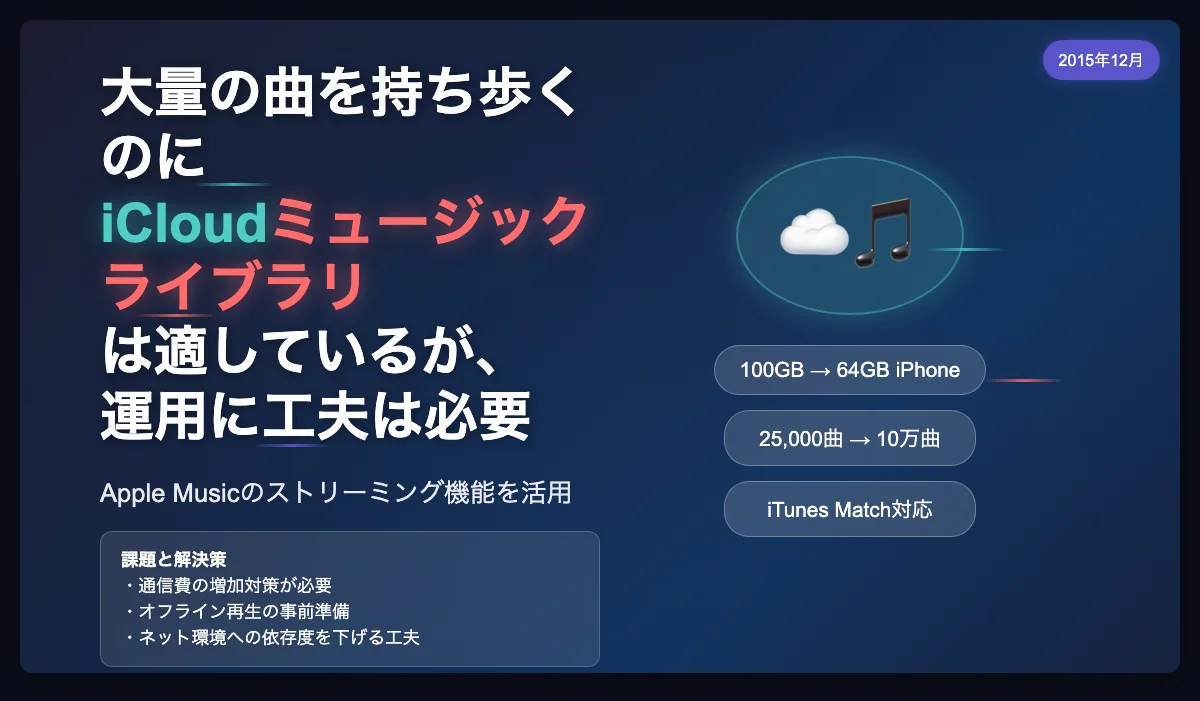 ネット環境の整備そのものが問題でもあります。特に、私のようにiPhoneをほとんどiPod touchとして使っている身分では、必ずしもストリーミング再生ができる環境に身を置いているわけではありません。これも、やはり聴きたい曲についてはダウンロードしておく対応が必要です。