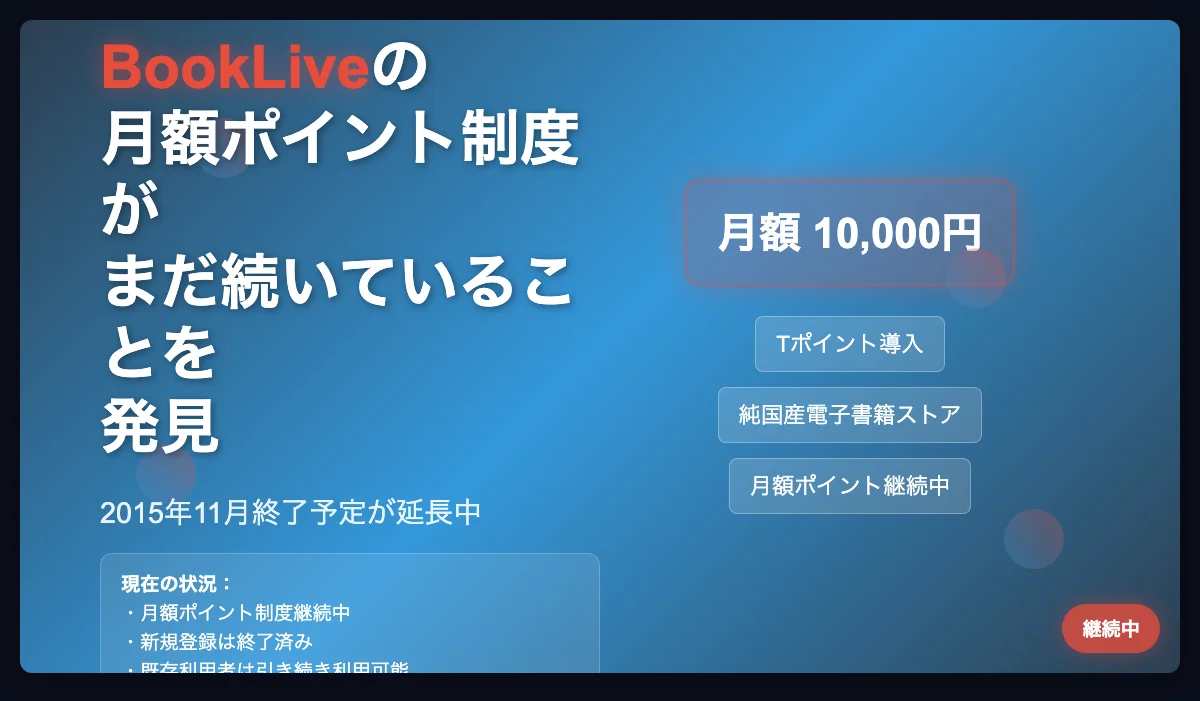 というわけで、新規登録はさすがにできないようですが、既にプログラムに参加している人は引き続きポイント購入できるようです。まぁでも、正直この月額ポイントというのは、どうしてもお金を使いすぎるので、今後も続けるかどうか、悩ましいところです(BookLiveはポイント制度を続けたほうが利益になるかと思いますよ…)。