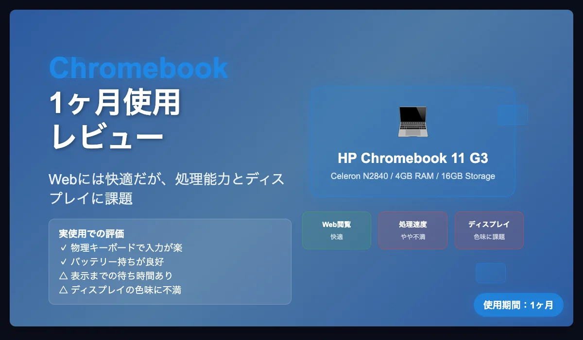 Chromebookを購入して一ヶ月が経ったので、所感を綴ります。Chromebookについては、「Chromebook 購入しました : 或る阿呆の記」と「Chromebook 購入二週間の雑感 いつでもどこでも気兼ねなく使えるマシン : 或る阿呆の記」という記事も書いています。