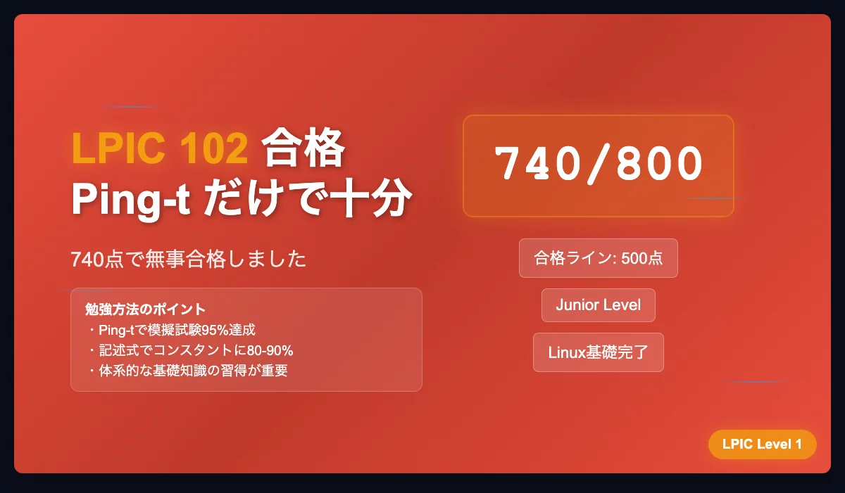 とにかく言えることは、Ping-tさえやっておけばLPICレベル1は恐るに足らずということです。引き続き、LPICレベル2を取得すべく、Ping-tで精進していきたいと思います。