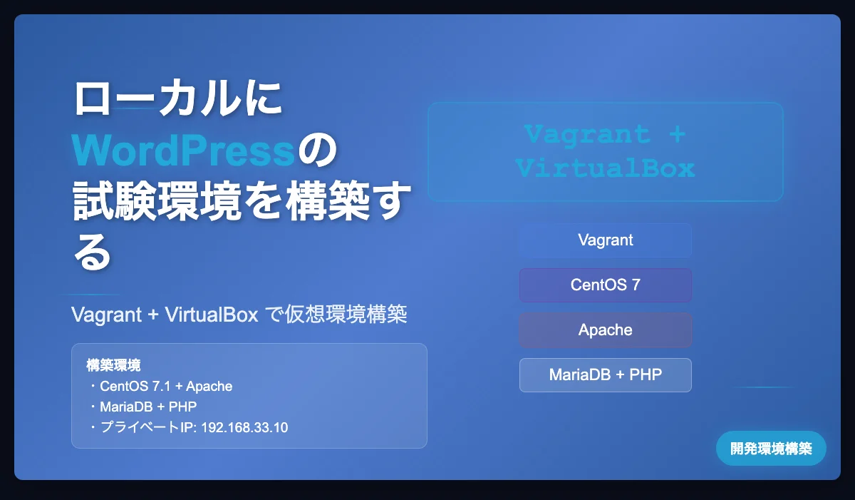 元々はWordPressのバックアップ、復元をローカル環境で行う記事として書いていたのですが、仮想環境の構築だけでもけっこうなボリュームになってきたので、記事を独立させることにしました。