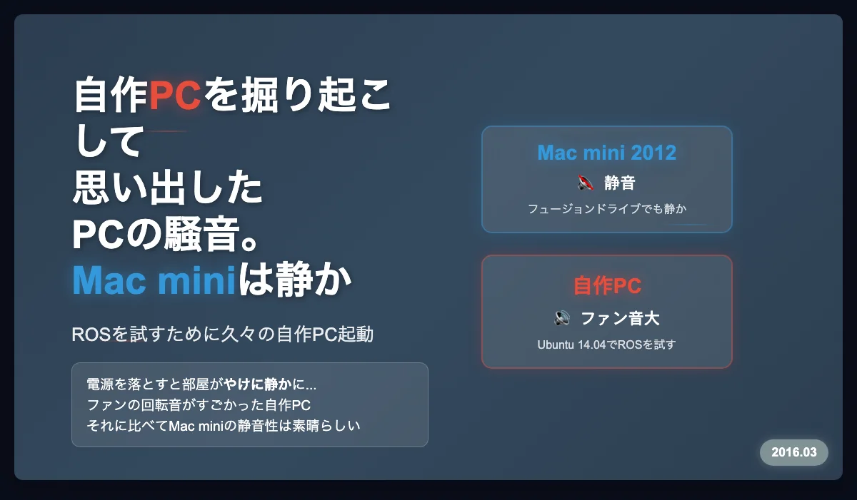 色々あって、昔自作したPCでを掘り起こして起動させました。懐かしい。稼働している間は気にならなかったのですが、電源を落とすと、部屋がやけに静かになりました。なるほど、どうやらかなりうるさかったらしい。それに比べると、Mac miniの静かなこと…Mac miniの再評価です。