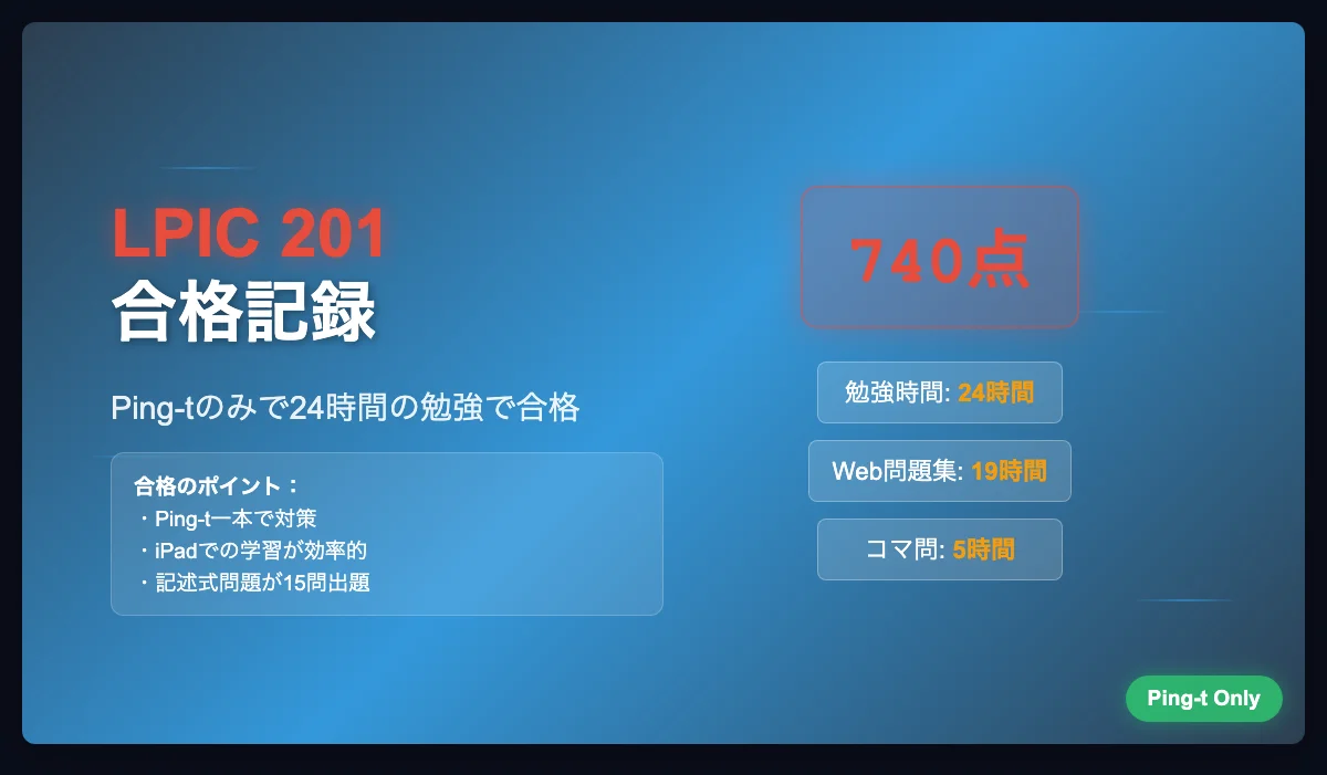 LPIC 201 合格。勉強法はPing-tのみ。勉強時間は24時間