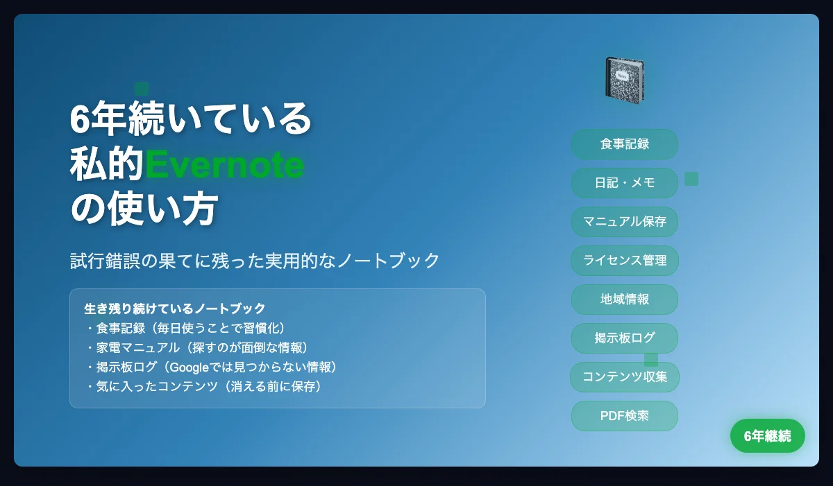 本記事では、自由度が高く、それ故にどう使ってよいかわからないと言われることが多いEvernoteについて、紆余曲折経ながらも使い続けている私のノートブックを記すことで、一つの使い方を提示します。