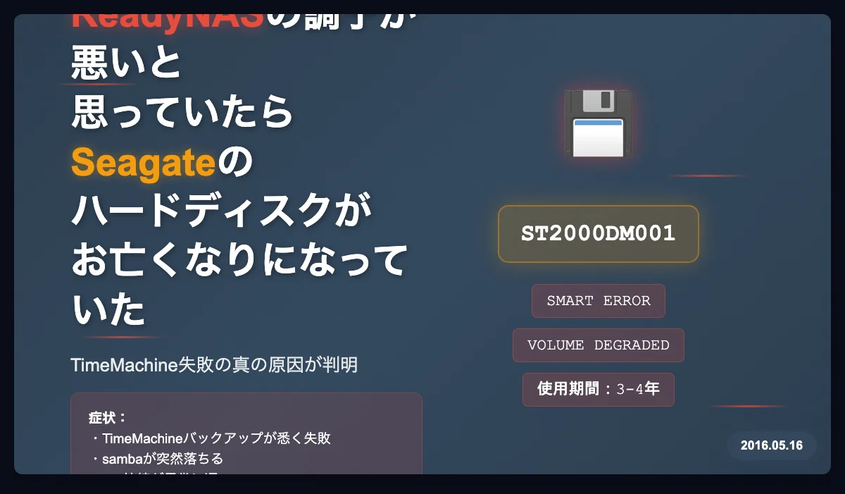 本記事は、やたらTimeMachineに失敗すると思っていたら、ReadyNASで使っていたSeagateのハードディスクがお亡くなりになっていた、という記事です。