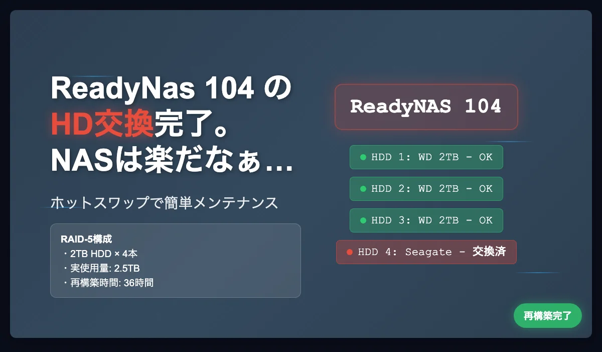 Webの管理画面から、不調なハードディスクのチャネルを確認します。本体を見ると、チャネルに相当する番号のインジケータが消灯しているので、わかりやすい。交換作業はとてもスムーズで、「ReadyNAS® 104 4ベイ デスクトップ型ネットワークストレージ(ベアボーンタイプ) RN10400 | 46,600 円 | ネットギア【NETGEAR】」にあるハードウェアユーザーズマニュアルの通りです。ホットスワップ対応のため、電源を投入したままの状態で、当該ハードディスクを抜き出し、交換し、挿入する。それだけです。2TBのハードディスク4本でRAID-5、実際に使用している容量が2.5TB程度の状態で、再構築に36時間ほどかかりました。エラーも消えて、不調なく動くし、満足です。次に死ぬのは、どのハードディスクかな?