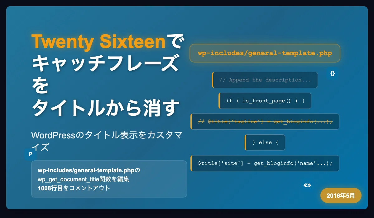 現在のWordPressでデフォルトとなっているTwenty Sixteenでは、フロントページのタイトルが「サイト名 - キャッチフレーズ」となっています。キャッチフレーズが長いと、titleが無駄に長くなり、不都合がある場合もあります。他テーマだと、header.phpやらfunction.phpやらをいじればよいことが多いようですが、Twenty Sixteenではwp-includesにある関数をいじる必要があるようです。