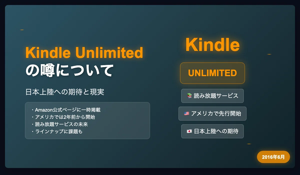 先日、ついに日本にもKindle Unlimitedが上陸するかという噂が流れました。発端は「【続報】時期尚早だったからか公式の Kindle Unlimited 関連ページが削除されてました (2016.6.20) : Kindleセール情報ブログ「キセブ」」という記事でして(よく調べてるものですね…)、Internetwatchやらが取り上げたので、私も知ることができました。まぁ、現在Amazonの当該ページは削除されているようですけれど、日本上陸の流れがあることは間違いないのでしょう。