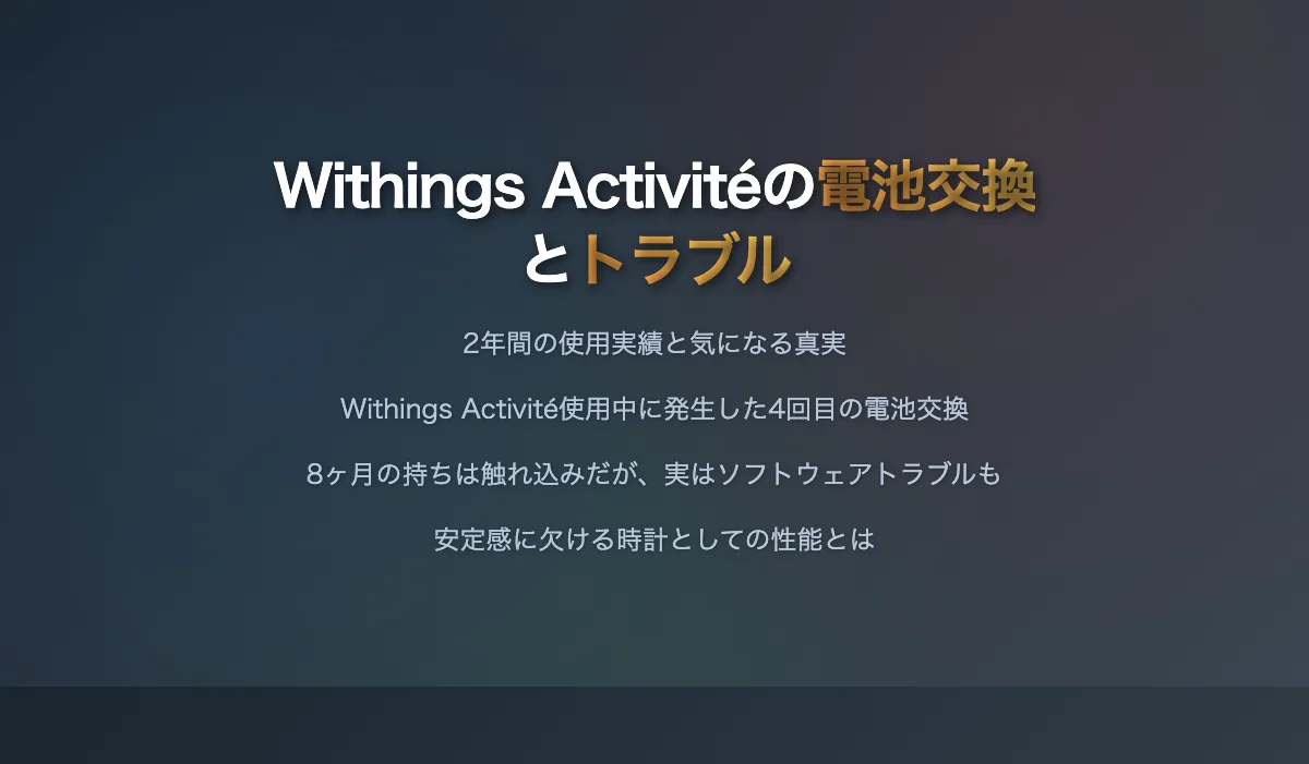 WithingsのActivitéを使っている。アナログ時計にしか見えないのに、実はBLE搭載のスマートウォッチというところが気に入った。使い始めてちょうど2年ほど。つい先日、時計が止まっていたと思ったら電池交換の時期だった。これで四度目。八ヶ月の電池持ちの触れ込みなので、ちょっと多いが、これは(恐らく)システム的なトラブルを電池切れと誤認したケースが混じっているから。時計として安定しているとは言い難い。
