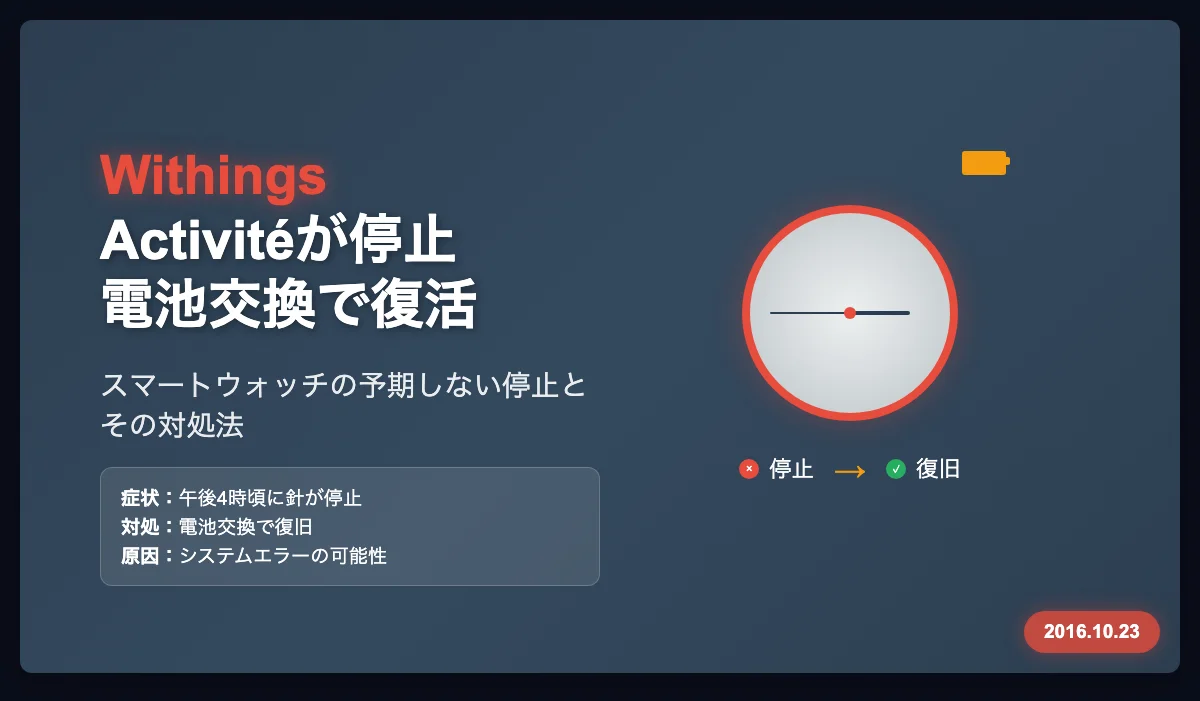 Withingsのスマートウォッチ、Activitéを愛用していますが、午後4時くらいから時計の針が止まりました。アプリもデバイスを見つけられない。試しに電池を取り替えてみると、再び動き出しました。電池切れではないと思います。恐らく内部的なトラブル。ここ一ヶ月でトラブルがちょいちょい起こっています。うーん。