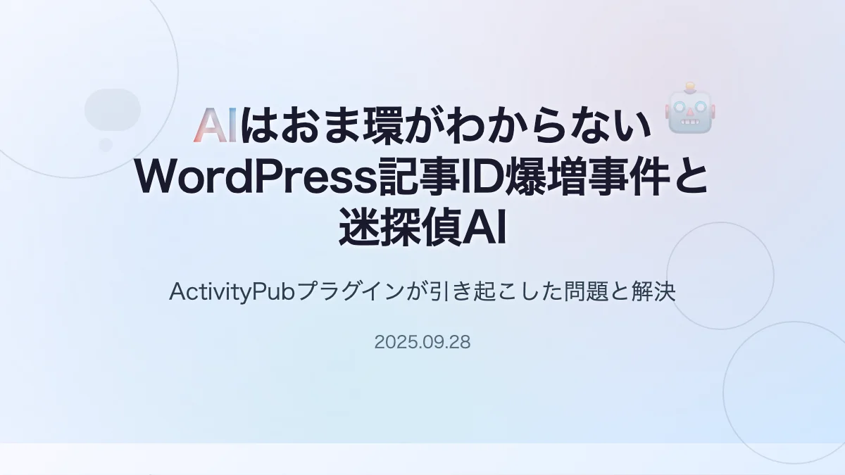 今回の事例で言えば、AIにとって問題設定は「WordPress REST APIでカスタムフィールドを更新すると、カスタムフィールドのIDが変に増加する」だったが、実際には「WordPress REST APIで投稿を更新すると、ActivityPubプラグインがフックし、ap_outboxという投稿タイプを大量に新規作成したため、wp_postsのIDが異常に増加する」である。