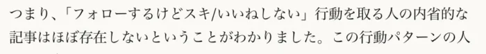 つまり、「フォローするけどスキ/いいねしない」行動を取る人の内省的な記事はほぼ存在しないということがわかりました。