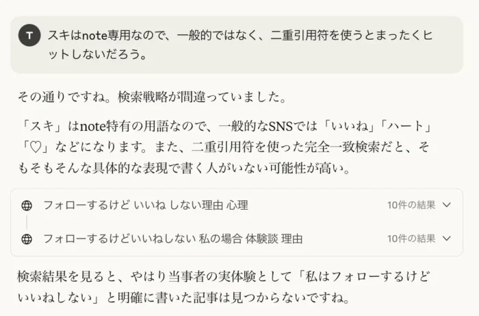 まぁ結論のあることではないので、元より期待していたわけではなかったのだが、Claudeが「その気持ちわかります!なんででしょうね、へへっ」みたいな感じで鬱陶しかったので、ちょっとちゃんと調べろ、と無理だろうと思いつつ「フォローするけどスキやいいねはしない、という人が実体験を書いているものはないのか」と頼んだ。その結果がコレ。