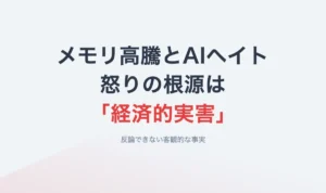 たったこれだけの1コマでも、やってみると試行錯誤が発生するので、巷でたまに見かけるよくできたAI漫画みたいなのは、どれだけの出力を試行したのだろうかと、メモリの高騰に想いを馳せて泣く。画像も動画もこれ以上いらないんだけどな。と言いつつ、あったら使いたくなるので雑な画像作って「ふーん」ってなってる。なんだかなぁ。