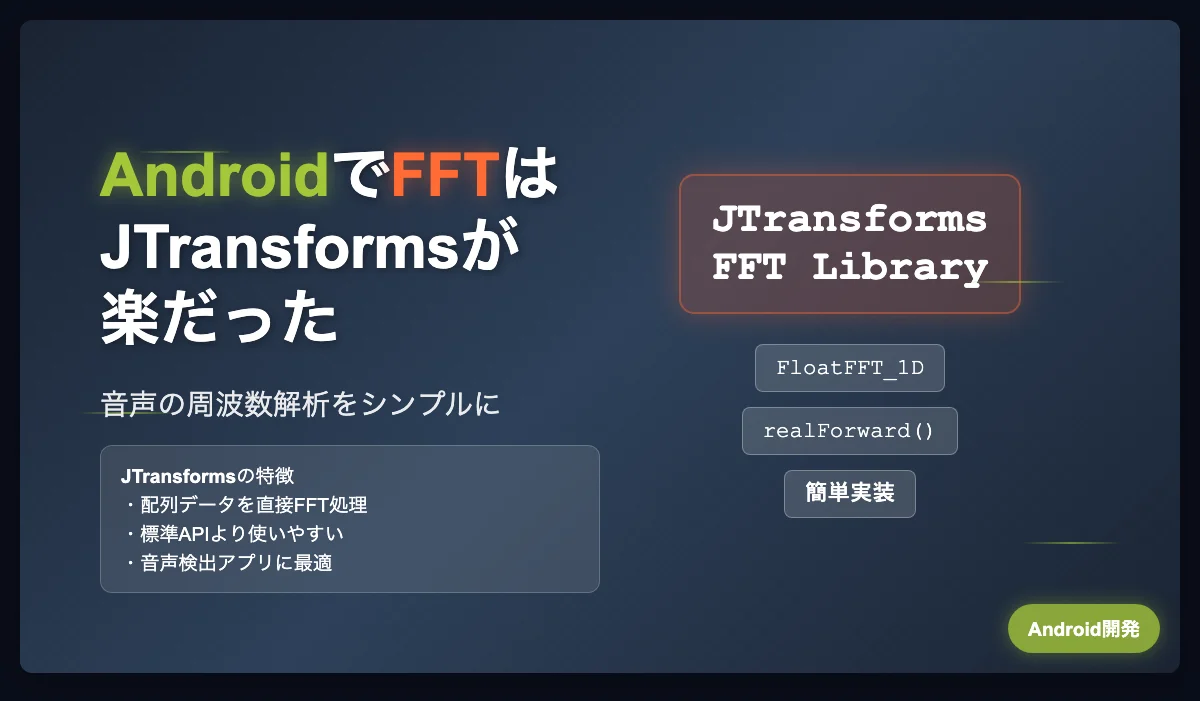 最近Androidアプリの開発をいまさらながらはじめました。今回作ったのは、音声をAndroidスマートフォンに入力し特定の音が鳴っていないか検出するアプリ。FFTで周波数解析して、周波数領域でピーク検出をするのが簡単そうです(時系列データだとノイズの影響が大きく難しそうだった)。それで、AndroidでFFTって、何がいいのかな…と調べると、標準APIのVisualizerの話がよく出てきました。…が、単純にFFTするだけなら、JTransformsが使いやすかった、という記事です。