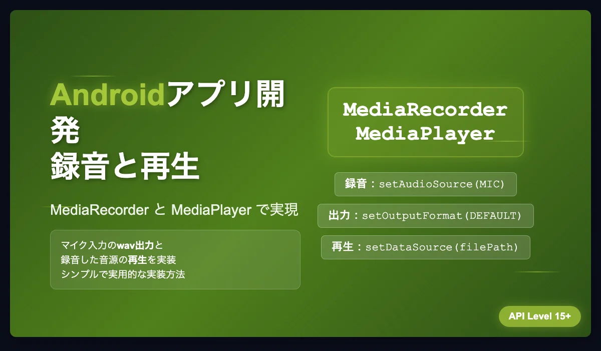 要は低次の細かい設定が必要な、たとえば音声解析などをしたいときにはAudioRecord、ただ録音したいというだけであればMediaRecorderを使うのが簡単であるということのようです。