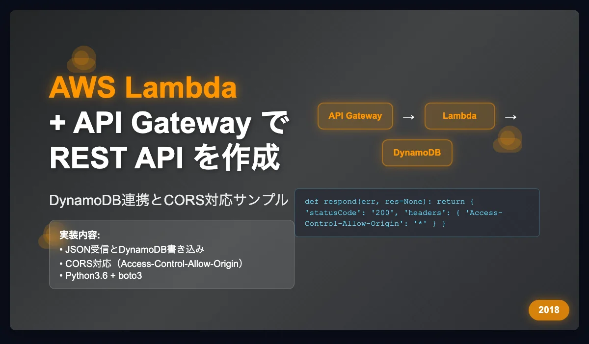 やたらと長い表題になってしまったがこのとおり。AWS Lambda + API Gateway でREST APIを作成する。API経由で値をjsonで渡してDynamoDBに書き込み、さらに返り値をjsonで得られるようなサンプルを作成する。Lambdaはpython3.6で書く。