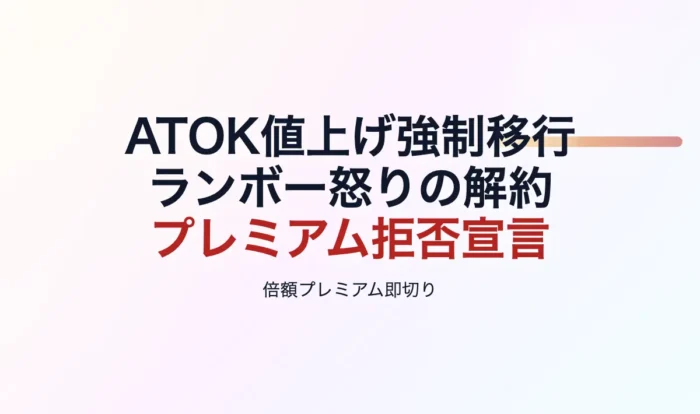 長いこと使っていたATOKを先日解約した。例の実質値上げであるベーシックプラン廃止のため。 「ATOK Passport」実質値上げにユーザー悲鳴 月330円プラン廃止、660円に - ITmedia NEWS ジャストシステムさんェ……。 Xで値上げを知りランボー怒りの即時解約 契約停止ならまだわかるのだが、サイレントに倍額のプレミアム以降させられる。説明も... -