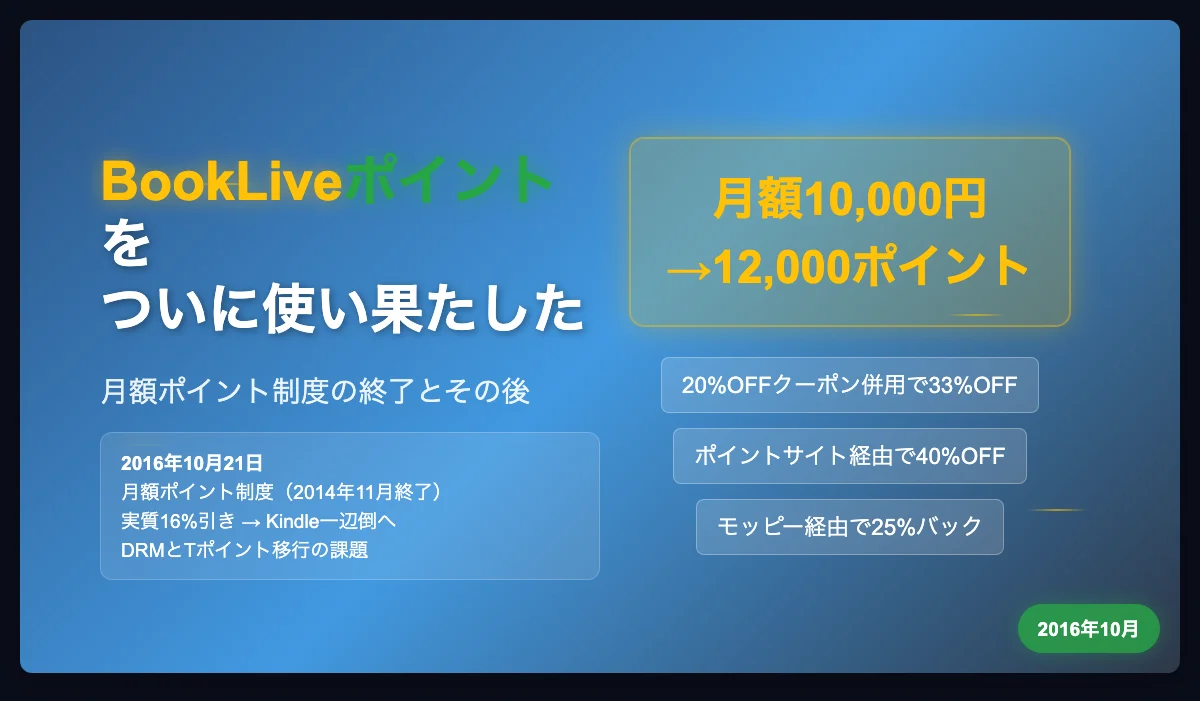 月額ポイント制度は、毎月10,000で12,000ポイントになり、よく本を買う人間であれば実質常に16%引きで本を購入できるもので、各種クーポンやポイントサイトなどを組み合わせると、なかなかお得に購入できる制度でした。たとえば定期的にある全作品20%OFFクーポンと組み合わせると、だいたい実質33%OFFになります。ポイントサイト経由で10%バックなどあると、4割引も普通。